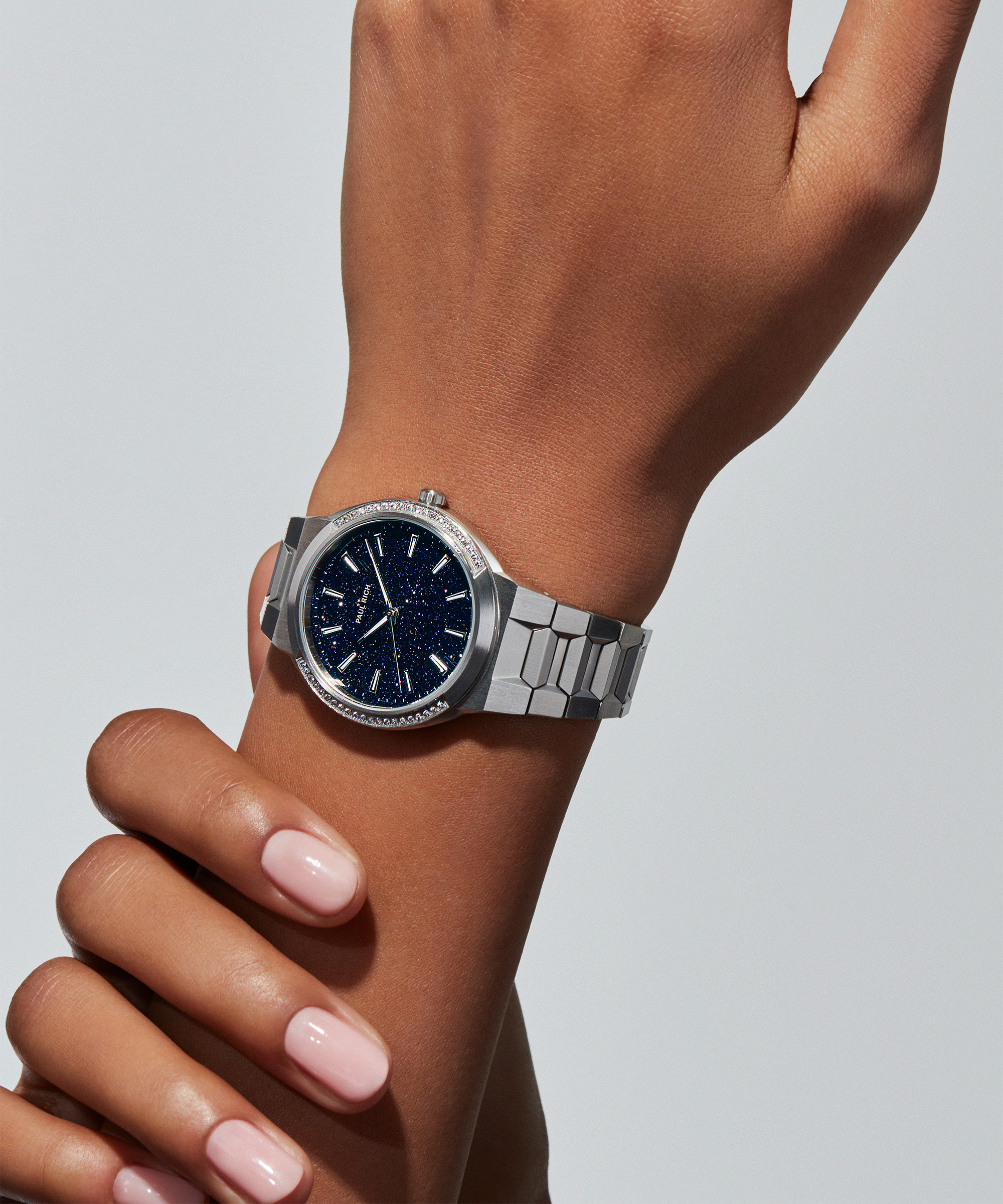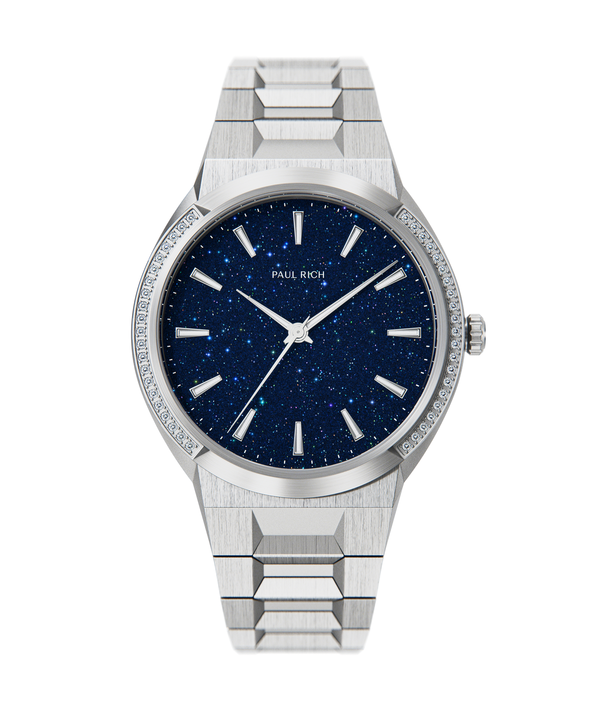 A monochromatic wonder. The Cosmic Dust timepiece for women boasts 42 cupid-cut rhinestones that beautifully reflect the light, giving the timepiece a dazzling shine and an air of sophistication that can’t be beat. This model has a stunning aventurine dial that looks like the night sky and will captivate anyone who sees it.