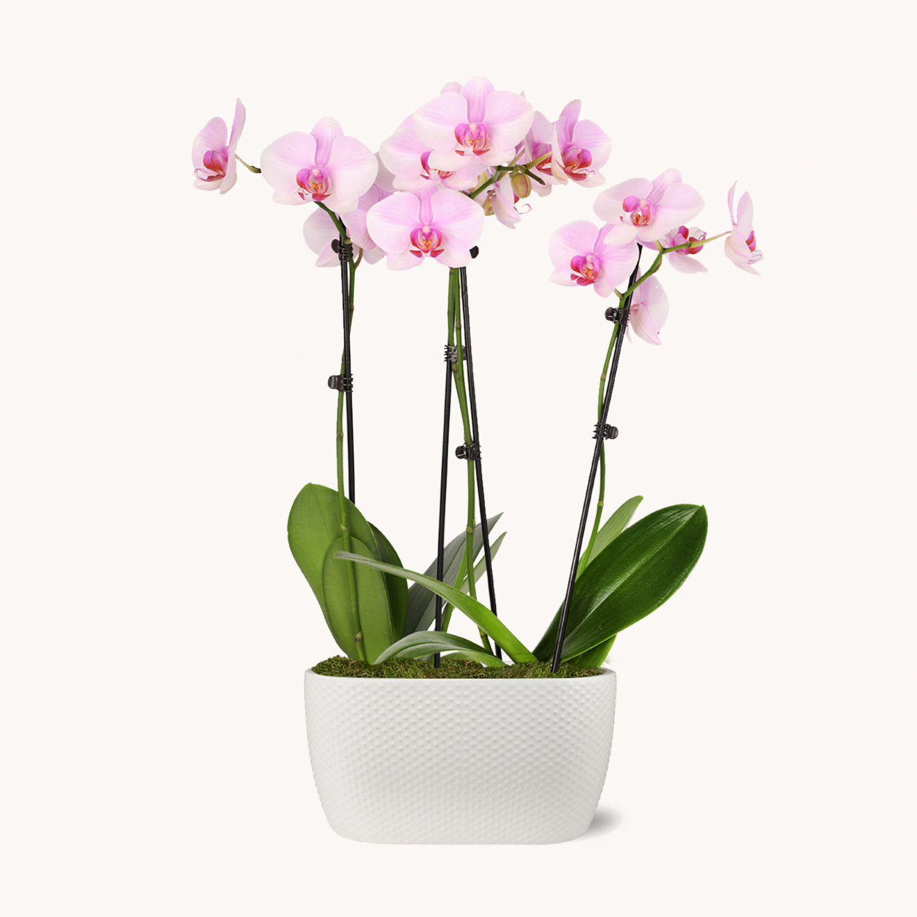 Flamboyance is an exquisite 10-inch light pink orchid, presented in a chic white pot. Its delicate blossoms exude grace and elegance, while its robust green leaves add a touch of vitality. Perfect for adding a splash of color to any space, this orchid embodies natural beauty and sophistication.